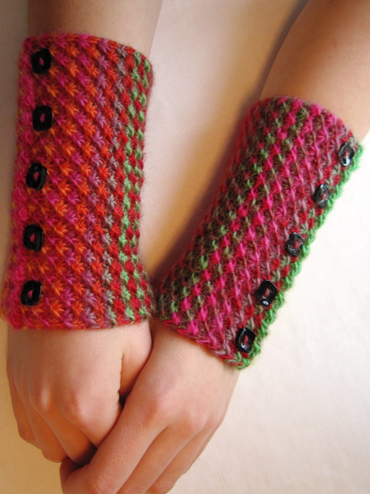 Muddarna som jag visade på syfestivalen stickade i bellismönster (Daisy stitch).